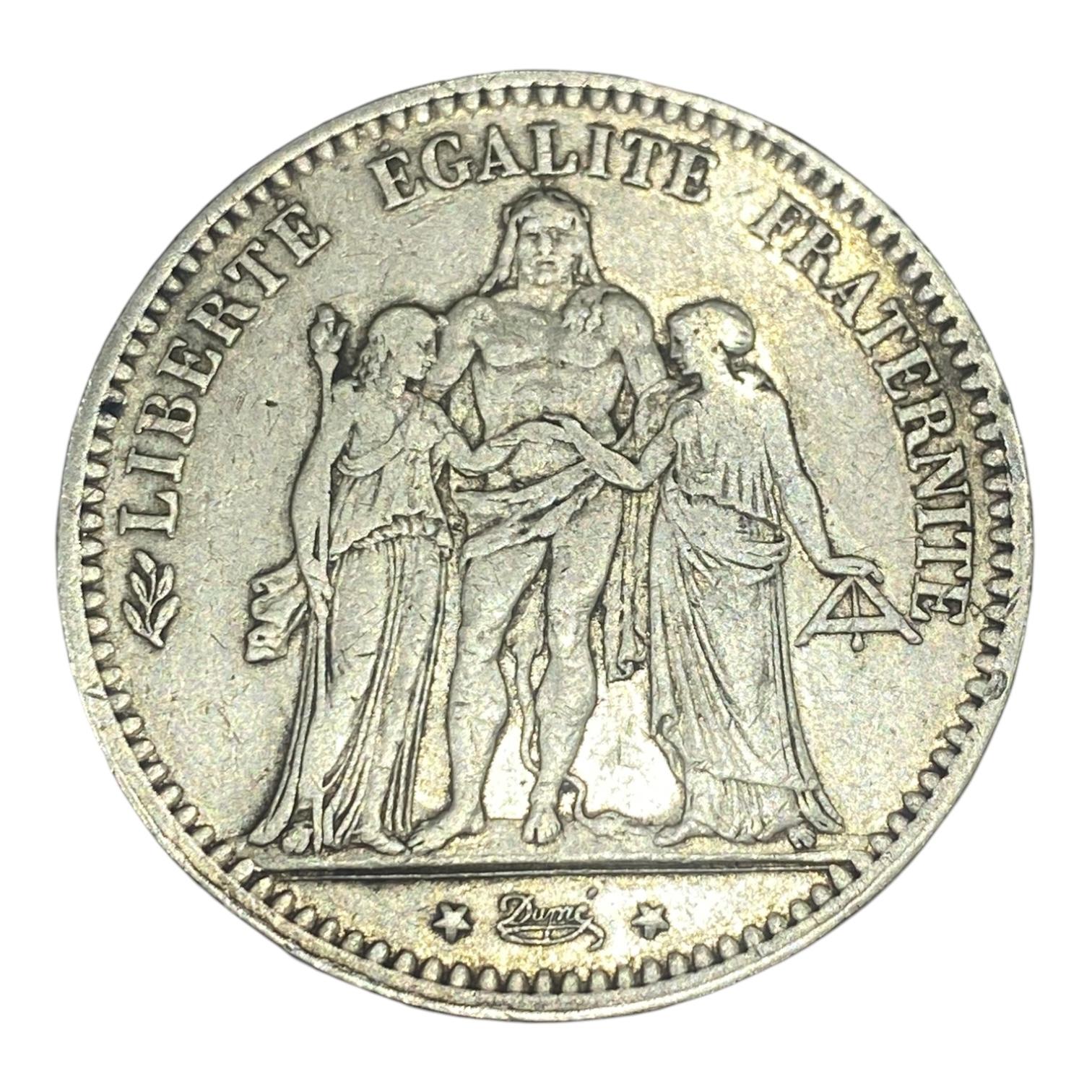 Cette pièce est une monnaie française de 5 francs émise pendant la Troisième République (1870-1940) et frappée à l’atelier de Paris en 1875. Elle est marquée par les républicains motivés de « LIBERTÉ ÉGALITÉ FRATERNITÉ », gravées par Augustin Dupré, un célèbre graveur. Fabriquée en argent avec une pureté de 90%, elle mesure 37 millimètres de diamètre et arbore la marque d’atelier « A ». Cette pièce est également connue sous le nom de « Hercule ».